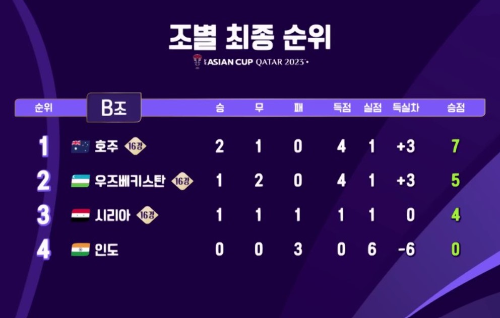 B조에서는 호주가 2승1무로 1위, 우즈베키스탄이 1승2무로 2위 그리고 시리아가 3위로 16강 진출을 확정이었습니다.