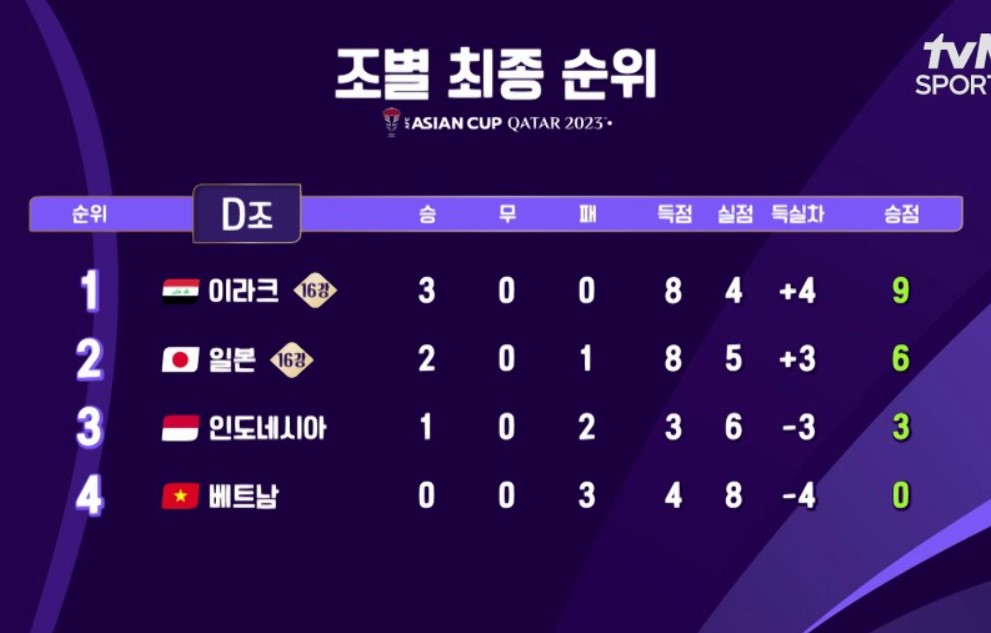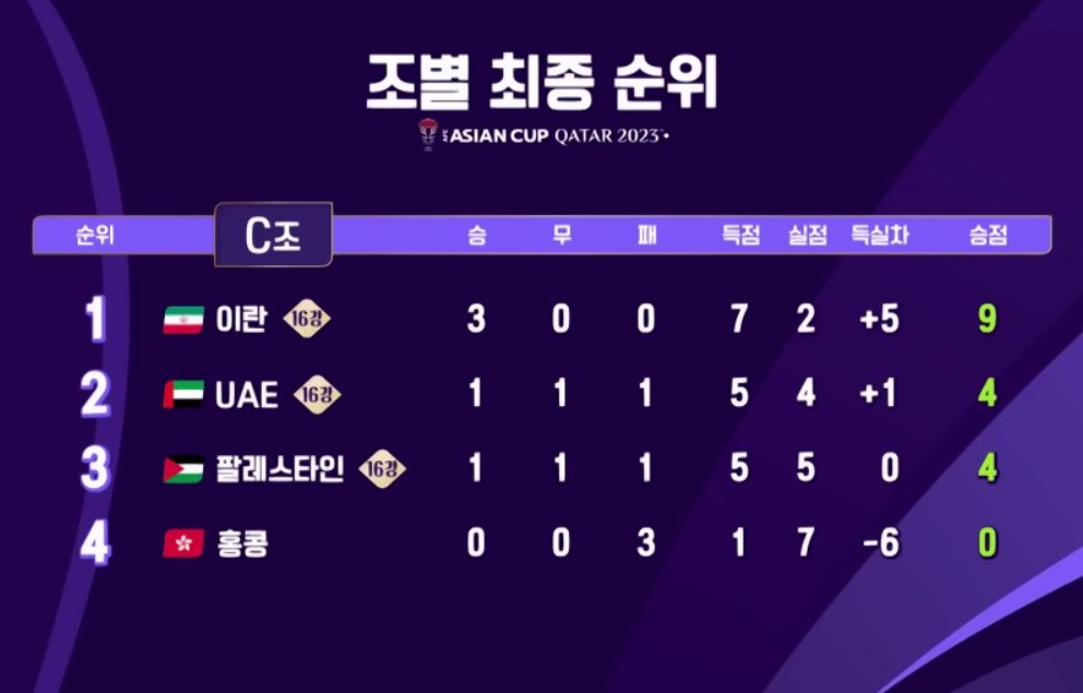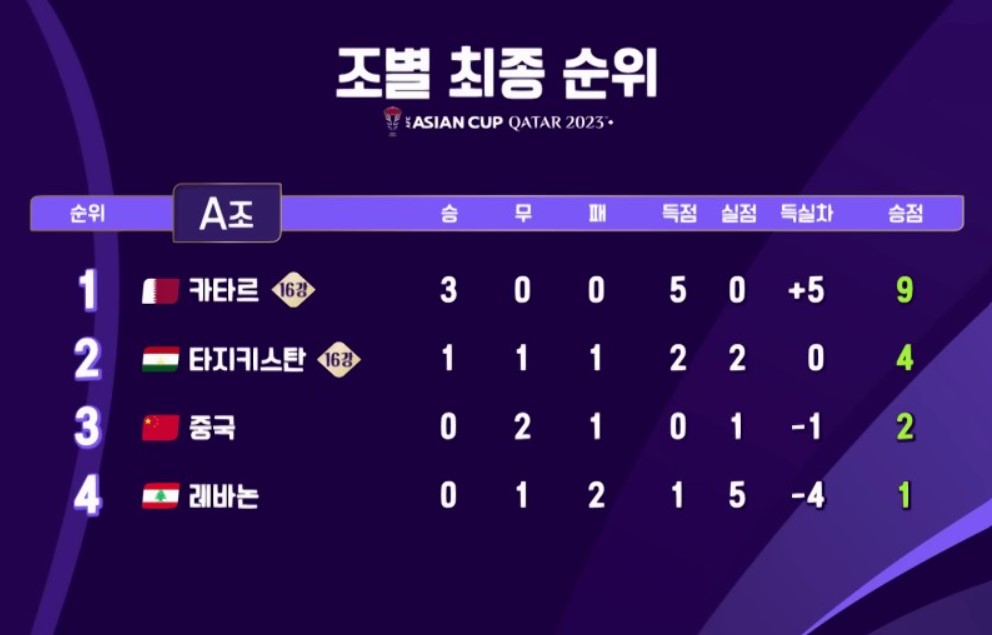 1. 2023 카타르 아시안컵 조별 최종순위