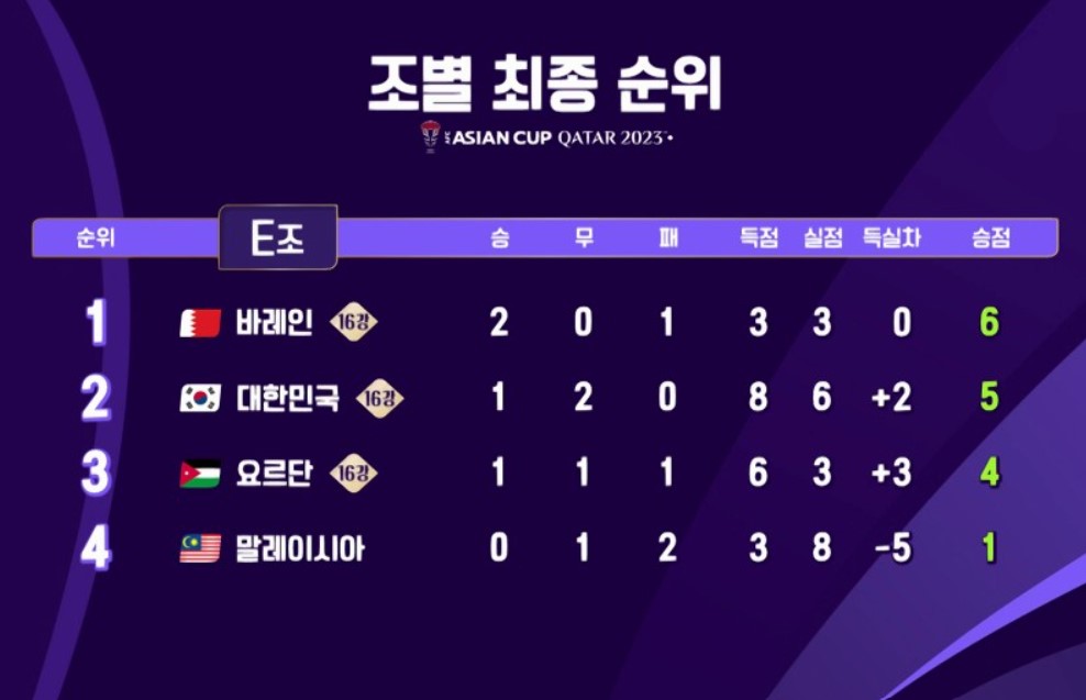 대한민국이 속했던 조별리그 E에서는 아쉬운 경기력을 펼치며 대한민국이 조2위를 차지했고, 마지막 3차전에서 바레인이 요르단을 꺾고 조1위로 16강에 진출하였습니다. 요르단도 1승1무1패 조3위로 16강에 진출했는데 16강전에서 바레인은 일본을, 요르단은 이라크를 만나게 되어 8강까지 진출할 수 있을지 눈여겨 봐야겠습니다. 16강부터는 지면 탈락하는 토너먼트 방식이기 때문에 대한민국 선수단이 최선의 경기력을 보여주기 바랍니다.