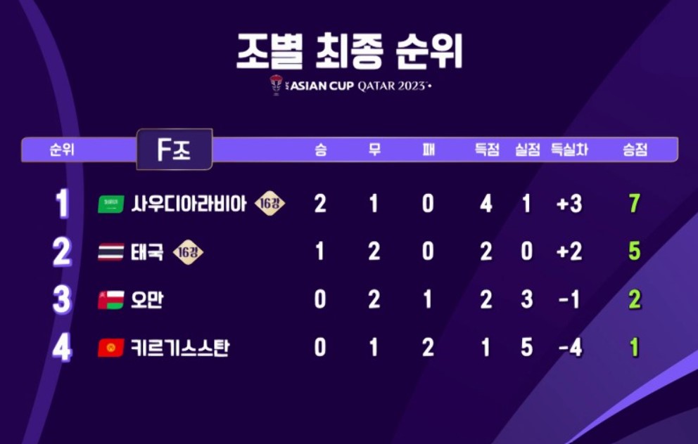 F조에서는 사우디아라비아가 2승1무로 1위를 차지하였고, 태국이 2위를 거두어 16강에 진출하였습니다. F조 1위인 사우디아라비아는 16강 전에서 대한민국을 만나게 되는데 최근 세계적인 선수들이 사우디아랍아 리그에 진출하여 전체적인 축구 수준이 올라갔을거라고 생각하는데 16강 전에서 좋은 경기가 되길 기대하겠습니다.